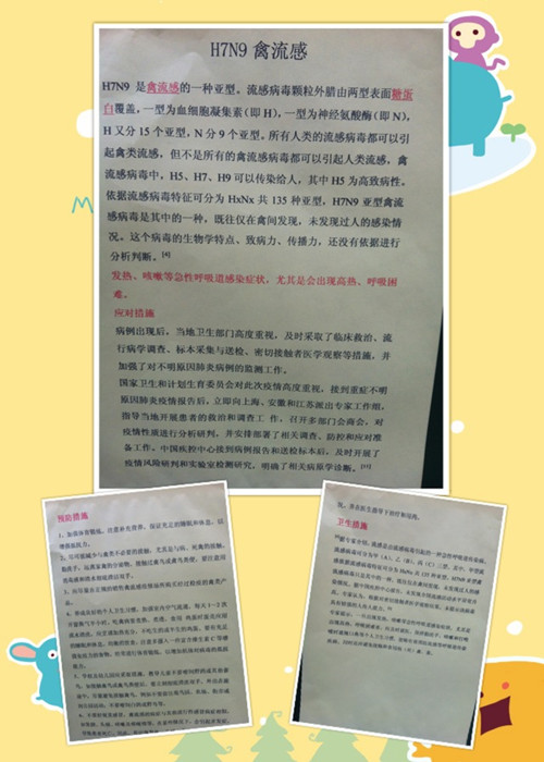 近期全国发现多个人感染H7N9禽流感的病例,目前,我园也已组织教师、幼儿进行了相关“H7N9流感防控知识”的学习,同时设置健康宣传栏,发放告家长书引起各位家长的高度重视,并要求全各班做好H7N9禽流感等传染病防控工作。