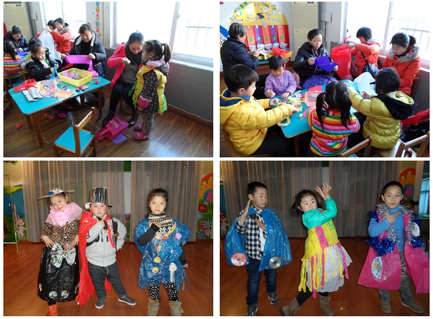 首先,家长和幼儿一起收集材料,并设计布置了“保护地球,人人有责”的宣传版地,让孩子们相互交流宣传;其次,家长和孩子们一起利用废旧材料制作了各种“时装”,孩子们穿上了自己和妈妈一起亲手制作的“时装”进行了“环保时装秀”。