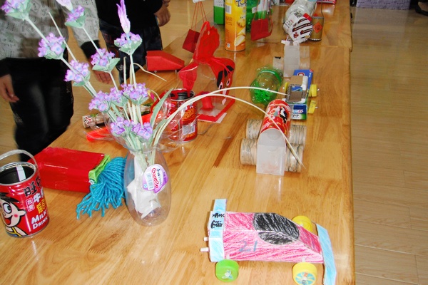 活动中,小朋友和家长们用自己灵巧的手,用饮料瓶、牙膏盒、牛奶盒、易拉罐等生活中常见的废旧物品,做出了各种颇具创意、形象逼真的“小屋”、“天平”、“小汽车”等手工作品。一个个形象逼真、富有创意的作品,凝聚着小朋友和家长的心血。