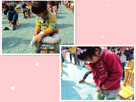 根据幼儿年龄特点,本次比赛设定的项目有小班穿鞋子,中班穿袜子、鞋子,大班系鞋带、穿衣服。随着裁判老师的一声“开始”,小选手们开始了紧张激烈的比赛。瞧,有的小朋友鞋子很快穿好站起来,有的小朋友穿袜子速度很快,有的小朋友很顺利系好鞋带、穿好衣服,在场的家长啦啦队热情地为选手呐喊,一片热火朝天的景象。尽管有的孩子速度较慢,但他们那认真的样子和自信的表情,却总