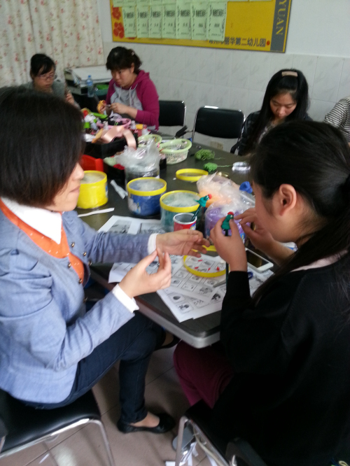 每天中午,杨园长亲自带领老师们聚集在一起,利用小朋友们带来的废旧物品,以及老师们带来的材料,制作各种各样美丽的发卡、相框、笔筒等等。