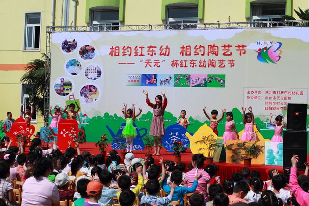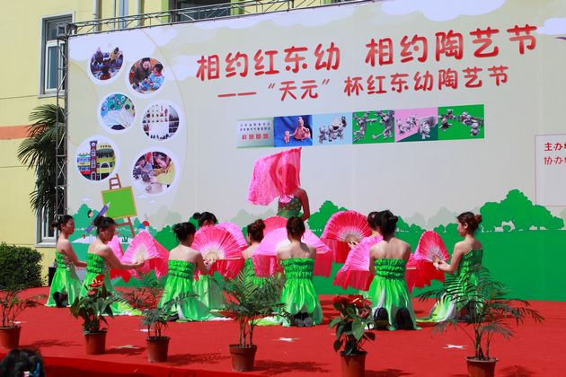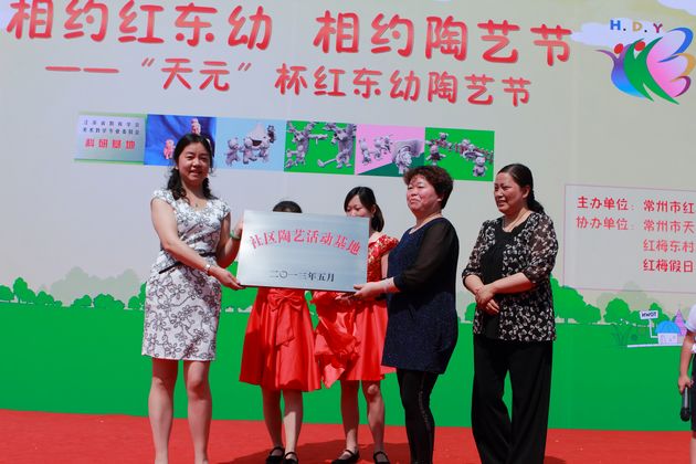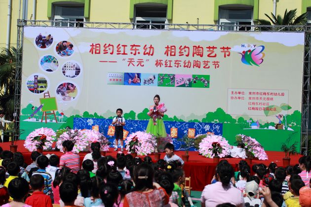 5月13日的红东幼儿园是沸腾的海洋、欢乐的天堂,因为这里正在举行由市区教育局领导、社区领导、社区居民和幼儿园家长参与的,主题为“我爱红东,我爱陶艺”的陶艺节开幕式。开幕式有亲子陶艺制作和幼儿时装秀《茉莉花开》、音乐剧《我爱陶艺》、人偶剧《老虎照镜子》、教师舞蹈《秀江南》等舞台剧表演,其中最有意义的是“社区陶艺活动基地”揭牌仪式。此次揭牌仪式标志着红东幼儿园正式面向社区开放陶艺室,达成资源共享。