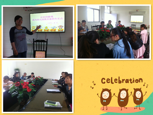 2013年5月17日,老师们准时集中在活动室,认真观摩了大班智多星开展的主题性民间游戏课题研讨活动。此次研讨活动,教师结合主题,自主选择了游戏《老狼老狼几点了》,游戏从孩子们的兴趣出发,老游戏,新玩法,让孩子们在游戏中体验到了集体游戏的快乐。游戏中,教师能根据孩子的各种表现及时调整游戏策略,将游戏角色表现得更加生动,形象,给游戏加入了新的色彩,整个游戏过程,孩子们玩得愉悦有序。活动过后,组织游戏的老师与观摩老师相互围坐,探讨游戏案例,在座的每位老师都提出了自己真诚的意见和建议。讨论结束后,蒋君老师为全体教师进行了“如何让民间游戏成为幼儿园教育新的成长点”的培训:民间游戏有哪些重要意义,民间游戏都是如何搜集,如何创新民间游戏,有效地组织应用民间游戏等方面进行有效的学习。