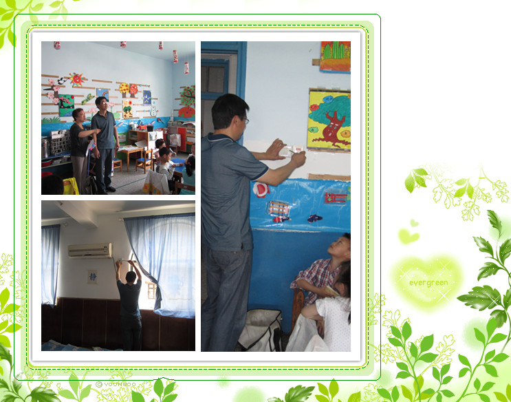 近日,朝阳幼儿园的后勤人员协同专业电工对园内所有的设施、设备进行了细致的检查,如电灯、电扇、电线、插头、插座线路、电表箱等,对存在的不安全隐患作了维修和整改。同时,针对夏季易发火灾这一情况,对幼儿园的消防设施又进行了一次彻底的检查。安全小组又给每个班级分发了安全记录表,请