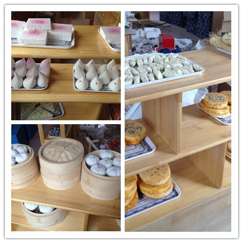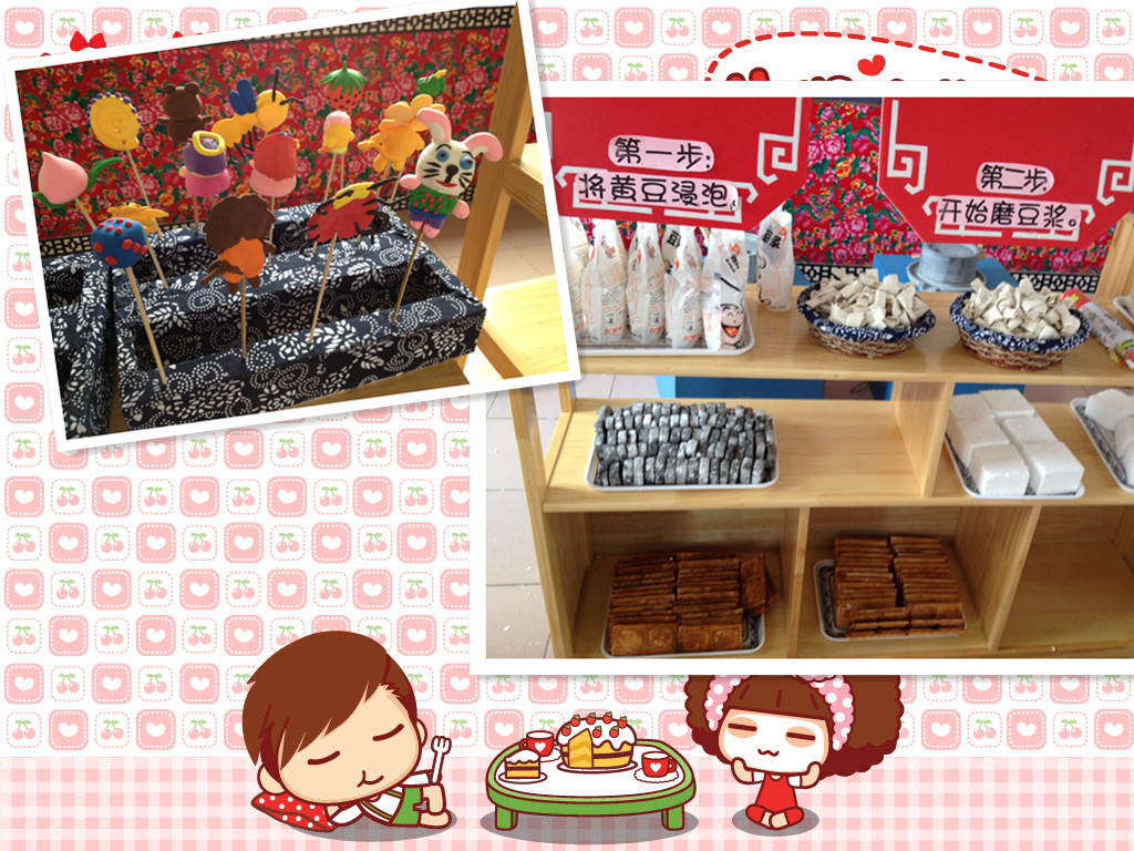 在美食一条街中,心灵手巧的老师们用墙纸剪成长方条,涂上白加黄变成了百叶;用废旧的泡沫反复切、削,涂上深黄,变成了豆渣饼;最难完成的是制作寿桃的过程,几位老师反复进行了多次尝试,最终得到大家认可,做出的寿桃真假难辨。在手工坊中,老师们用泡沫盒外糊兰花布,制作成彩泥小插盒,孩子们可以将民间工艺泥塑插于其中,像这样的民间小特色还有很多,很多,我们的“民间工艺小作坊”各区域内容日渐丰富。