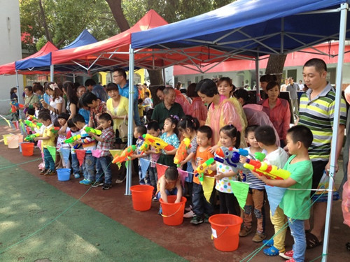 活动在大班年级集体舞蹈中拉开序幕,小朋友们整齐的动作,可爱的笑容赢得家长们的阵阵掌声,让我们老师们也觉得无比自豪和欣慰。接下来大班年级举行了一场别开生面的飞机模型比赛,看孩子们带来各自的“宝贝”飞机模型,擦拳磨掌的样子真是分外可爱。中班的创意活动“堆堆乐”在大班活动结束后紧接着开始啦!活动中大家相互协作,让我们感受到“小家庭”带来的“大快乐”。最后压轴的是小朋友们最开心的节目——小班年级的“水枪大战”,一场“战役”下来,孩子和家长们都可以说是“畅快淋漓”,以往的儿童节大部分是孩子表演家长看,那样的活动孩子们是被动的,他们也没有什么快乐不快乐,甚至有些小班小孩上台就吓哭了。这样创新的游戏活动让家长们觉得非常有意义,因为他们看到孩子们真正快乐的笑容。很多家长都说明年还要再举行这样的活动。