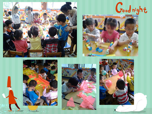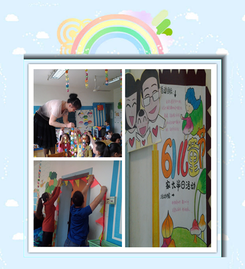 离节日虽然还有几天,但每个教师、每个孩子、每个家长都在紧锣密鼓地准备着,大家集思广益,成了创设环境的能工巧匠。海报贴出来了,上面的内容引领着大家各自分工,互相合作,真是件有意思的事情!孩子们画的画,剪的剪,家长们拉的拉,贴的贴,彩旗空中挂,彩带梁上悬,气球四周飘,孩子们如快乐的小鸟,活动室是多姿多彩的世界,好似节日的精灵在召唤着每一个人的心灵。