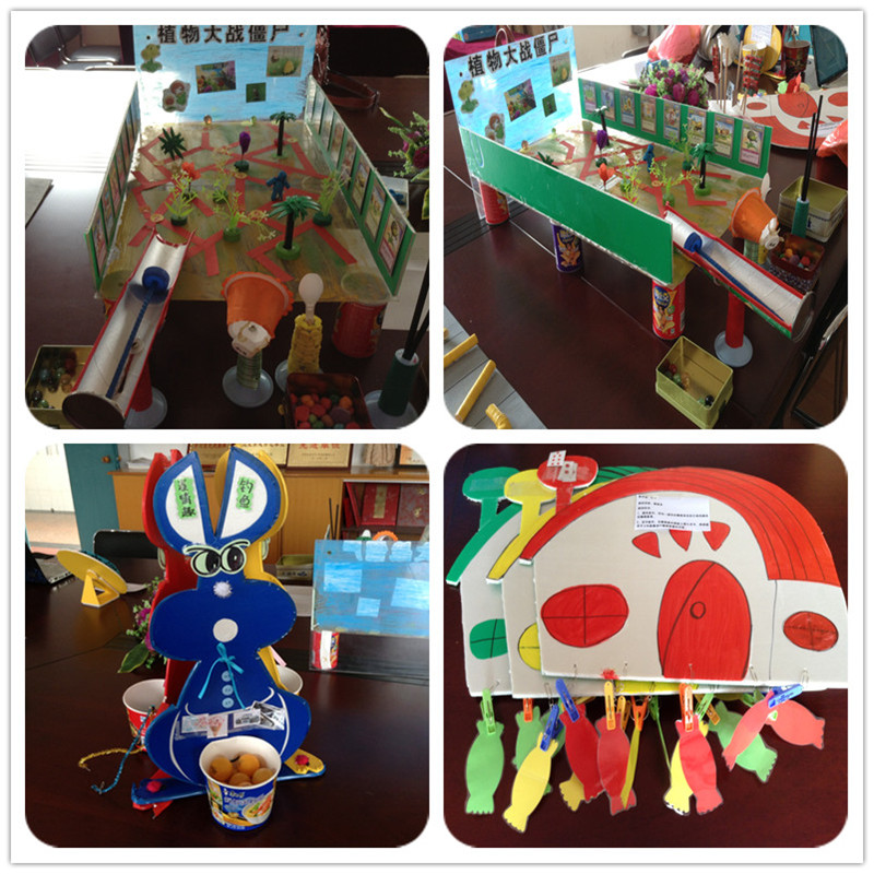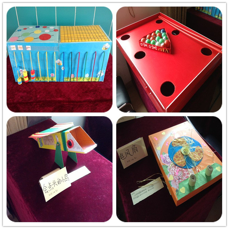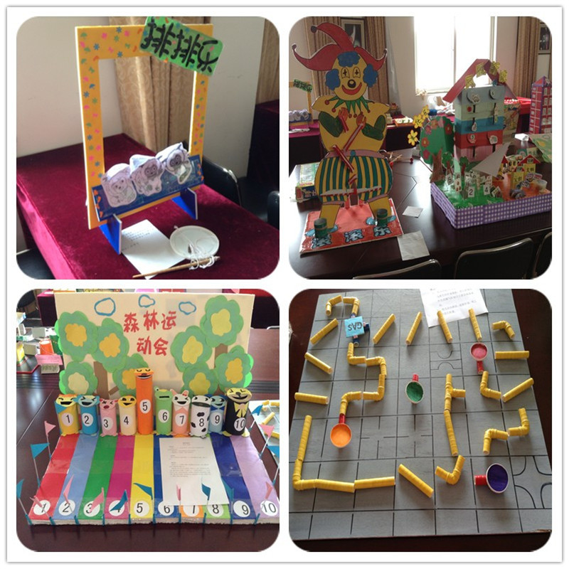 由丰富多样的材料制作而成的教玩具形式多样、设计巧妙、功能各异。有利用废旧纸箱、瓶盖制作的“瓶盖趣玩箱”等数学思维类教玩具;有根据幼儿喜欢的游戏制作的“天然气大亨”等益智类教玩具;有发展幼儿手部精细动作的“瓢虫与母鸡”等操作动手类教玩具,还有让幼儿百玩不厌的科学探索教玩具“弹珠也疯狂”等……充分展现了教玩具的创新性、教育性、趣味性及可操作性的特点。