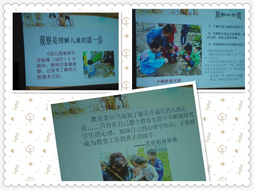 《纲要》中也强调了观察的重要性。庄园长将观察的概念、原因及价值逐一帮助教师梳理,结合案例,促发讨论交流的话题,现场积极参与,气氛热烈,对我们日常保育工作里有现实的指导意义。观察的要求和方法,关键要领,值得推敲和借鉴。同时离不开《纲要》和《3-6岁儿童学习与发展指南》等指导性文件的研读,对照不同年龄阶段的发展需要和规律特点进行实际操作。