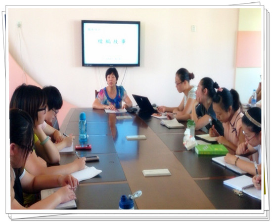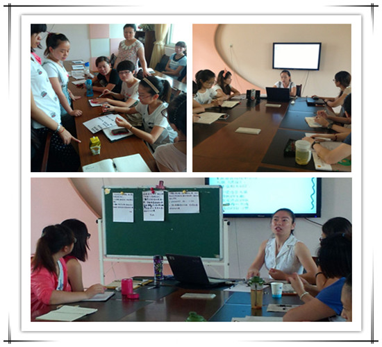 首先,开展的是园本培训之---续编故事,小、中、大年级分为三个小组,分别就续编故事《战胜大灰狼》进行小组内的评比。而后,小组推选出的三位代表们富有童趣而又生动的语言、恰到好处的表情和肢体动作、抑扬顿挫的语调,将故事演绎得惟妙惟肖。接下来开展的是园本培训之---如何备课,以年级组为单位进行备课的修改,各个年级组成员激烈地进行讨论,并将讨论后修改的内容记录下来张贴在黑板上,全体教师成员进行交流学习。最后,开展的是园本培训之---小游戏介绍,在培训过程中,老师们彼此分享了很多游戏,包括手指游戏、智力游戏以及民间游戏等。此外,老师自己也参与到游戏中,感受游戏的乐趣。