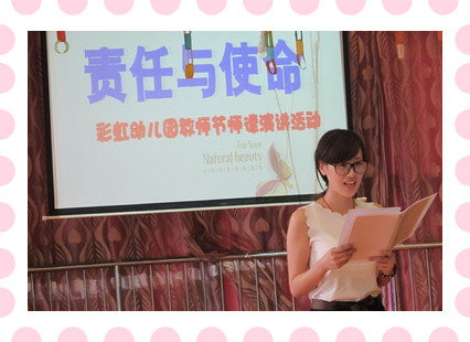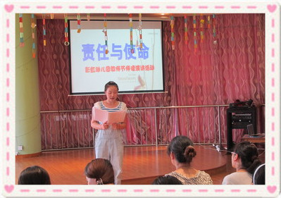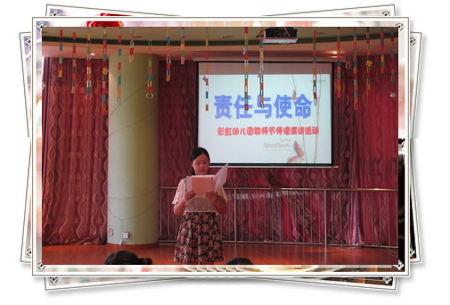 为进一步弘扬这种敬业爱生、严谨治教、探索创新、乐于奉献、团结合作的师德精神,在第29个教师节来临之际,彩虹幼儿园开展了“责任与使命”教师师德演讲来庆祝自己的节日,用责任和使命来诠释了自己对孩子们的爱。