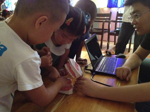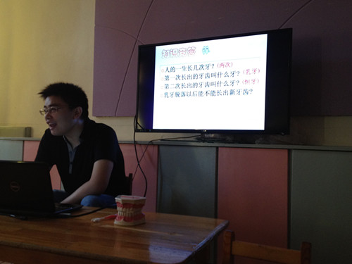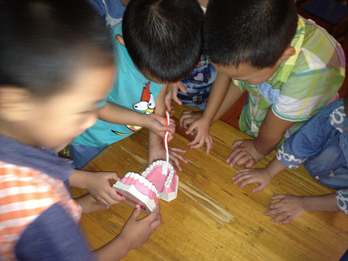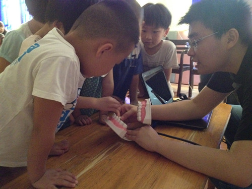 在宣传过程中,口腔医生以图文并茂的形式,让孩子们通过欣赏简单易懂的图片了解儿童口腔卫生的重要性,并反复强调要坚持天天刷牙,定期检查,少吃含糖食品,用餐要细嚼慢咽,避免碎骨、砂粒等损害牙齿……宣传活动尾声,孩子们和口腔医生进行了热烈地互动,孩子们提出了许多有趣的问题,并得到了一一解答。瞧,他们正专心琢磨着一套牙齿的模型呢!(姚昕燕、李扣兰)