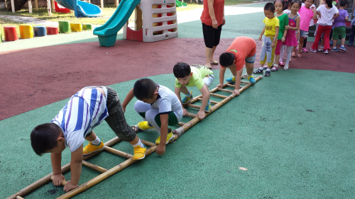 随后孩子们一字排开,迈起自己的脚步开始向前出发!孩子们的个性不同,所以在竹梯上行走的姿势更是多样,一开始都是从竹梯间的小洞穿行、随后胆大的钰凯把脚抬到了竹梯上面,他想尝试站在竹梯上面行走的感觉;但因为身体平衡能力的欠缺,刚走两步身体就摇晃了起来,聪明的米奇赶紧趴下并用手来支撑,意外的举动却让他发现原来也可以这样来爬竹梯;有了米奇的带动,后面的博文、睿睿纷纷效仿,在模仿“小乌龟”行走的过程中也第一次体验站在竹梯上行走的感受。通过参与户外活动,每个孩子都能够得到锻炼和发展,而且还能学习到新的玩法,感受游戏的快乐。