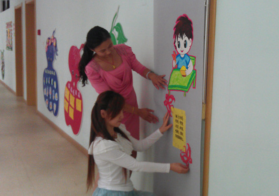 考虑到小班幼儿的年龄特点,我们将主题确定为采用“图片式儿歌”的方式进行美化,为此我们特意选择了《搭积木》《扎小辫儿》《大米饭》《穿衣》等贴近幼儿生活的儿歌,加上绘声绘色地图片,让消防栓穿上了一件漂亮的文化衣裳。