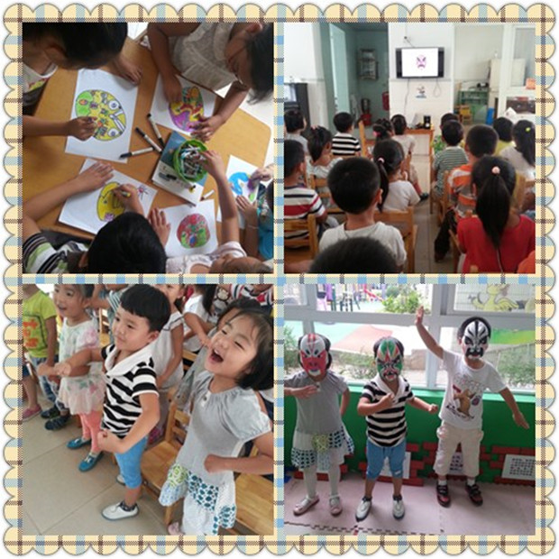 为了让孩子们了解京剧、喜爱京剧,感受中华民族“国粹”的艺术魅力,我们在大班幼儿中进行京剧艺术活动,老师针对幼儿的情况利用常识活动、随机教育引导幼儿认识了生、旦、净、丑及他们各自的特点,还组织幼儿观看录像,它不但可以扩大幼儿的视野,丰富他们的知识,还能保持和发扬民族文化,让幼儿从小树立民族自豪感和自信心,为自己是一个中国人而自豪。