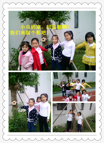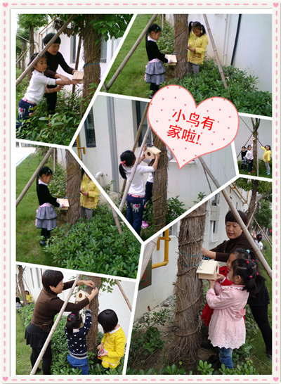 当园长妈妈拿出一只只木制的小房子时,孩子们兴奋地喊:“哇!这是鸟窝,是小鸟的家。”孩子们在园长妈妈和老师的带领下一个个高兴地提着鸟窝走出教室,把鸟窝挂在了一棵棵树上。孩子们开心地欢呼:“小鸟有家啦!小鸟有家啦!”瞧!孩子们还在鸟窝下幸福的拍照留影呢!