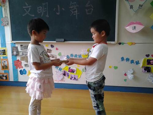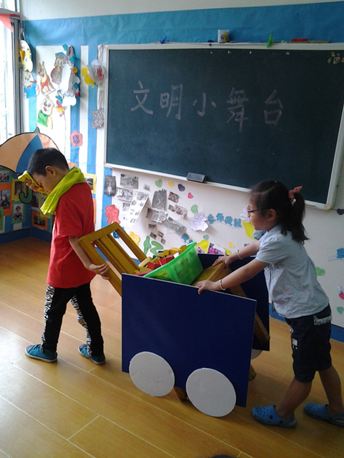 新世纪幼儿园中班小朋友在老师的引导下,自编自导,自娱自乐,把生活中的文明行为用情景表演的方式进行宣传。瞧:在文明小舞台上,“小演员”各显神通,有捡到钱包主动归还的,有帮助体力劳动者推车的,有帮助盲人过马路的……通过生动形象的表演,孩子们深深体会到文明的可贵!同时也理解了班级的文明口号:“你对我微笑,我向你问好!你帮我一把,我助你一臂!”