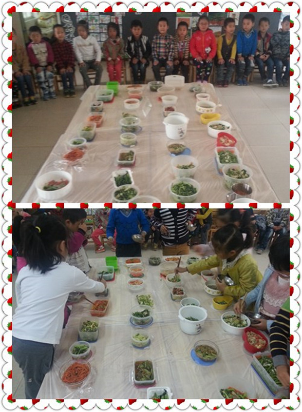 2013年10月18日,果果四班的孩子们围绕“金色的秋天”主题,带来了和父母共同制作的蔬菜,热热闹闹地开展了一次“蔬菜自助餐”活动。活动中孩子们通过说、看、品尝等方式了解了各种蔬菜的制作方法及营养价值。在品尝过程中,那些原本不爱吃蔬菜的孩子也加入了品尝的行列,所有的孩子都吃得津津有味。