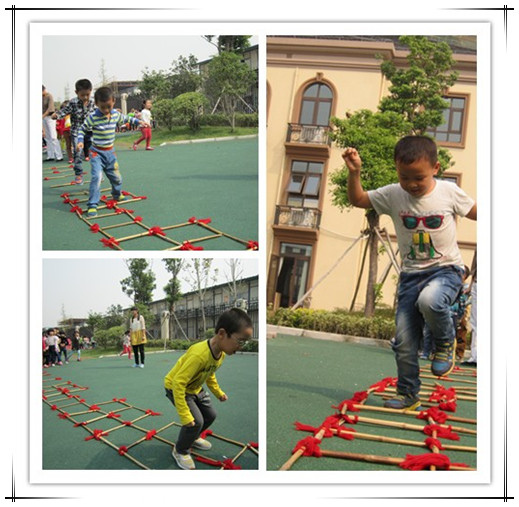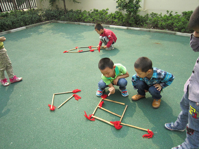 户外体育活动时,孩子们也常常自己用粉笔在地面上画出房子形状,放个小沙包来跳。考虑到这只是单纯锻炼了幼儿的体能,为了发展幼儿的各种能力,在此基础上,我们又加大了难度,引导幼儿自由结伴将竹棍摆在地上组合成各种房子的形状,让孩子自己创新出新的玩法。这不仅需要调动观察力、注意力,而且要求空间思维,审美观念。因此,改编后的“跳房子”游戏,更加富有挑战性、创造性。每次拼摆出的房子都不一样,幼儿跳房子时更加乐此不疲,增加了孩子探究的兴趣和挑战性。