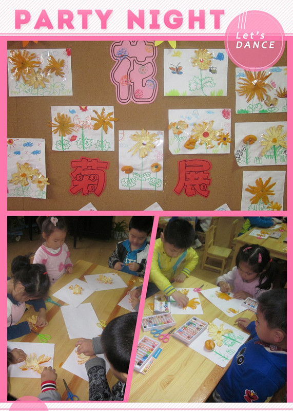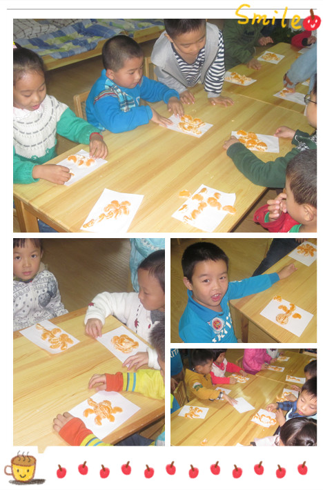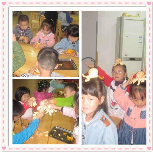 看着这么多的橘子,老师有了新创意,何不让孩子们一起来玩橘子?看孩子们学剥整个的桔子皮,用橘子和皮连接的造型做成小章鱼,又用一片片的橘瓤摆出各种拼图,还用橘皮做成菊花拼贴画,瞧瞧孩子们的作品多棒啊!