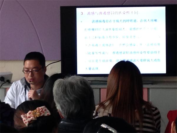 讲座中,医生就目前流行性感冒的发病季节、预防以及治疗措施,幼儿常见病、传染病(如伤风、支气管炎、扁桃体炎、肺炎、疱疹性咽炎等)疾病的防治对家长作了详细介绍。并用一组组数据及一个个鲜活的案例为家长们细细讲解流感疾病的症状,使家长能早发现、早处理、早就诊,为孩子争取最佳的治疗时期;家长们鸦雀无声,认真听取,还有部分家长带来了笔记,细细地记下各种疾病的关键信息。当会议接近尾声时,社区医生还对家长进行了一对一的交流,为家长答惑解疑。