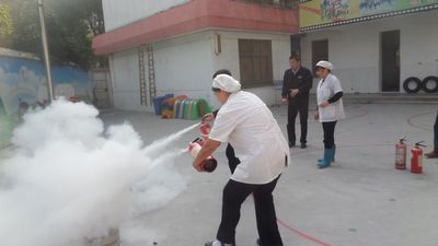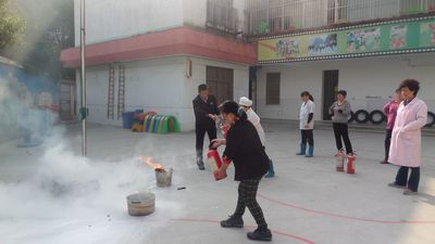 在 一年一度的“119”消防日到来之际,天宁区丽华三幼在园所的空旷地带进行了一次消防演习----干粉灭火器的使用的演练。首先全体食堂工作人员和楼面清洁工阿姨在幼儿园活动场地的东北角集合,并在空旷地带点燃了一堆篝火,由后勤教师讲解了干粉灭火器的具体使用步骤:使用前要将瓶体颠倒几次,使筒内干粉松动,然后除掉铅封拔掉保险销,左手抱着瓶体,右手提着压把,在距火焰