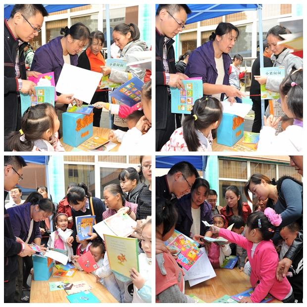 活动当天上午,户外活动操场上,撑起了一把把大伞,大伞下摆放了一张张课桌,上面放满了小朋友及老师捐献的绘本。你瞧,“爱心义卖”现场就像一个大市场,充当小慈善家的“小大人们”摇身一变成了买家,几岁的小家伙们瞅准自己喜欢的绘本,毫不犹豫地留下。而站在身后的家长们,看见孩子们如此积极地“购物”,各个笑容满面,扮演起了“会计”“随从”的角色。