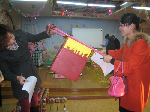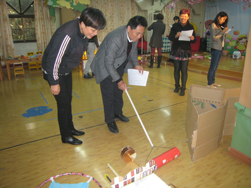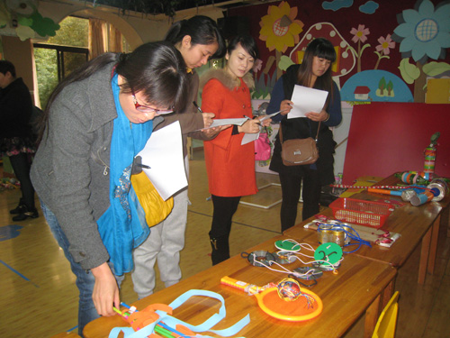 评委们以“材料的选择、器械的品种与数量、器械的安全、器械的一物多玩及创意性”等几个方面为标准,对自制的晨间活动器械进行了评比。