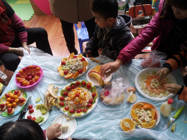 活动即将开始,孩子们早已做好准备,一展身手。拼盘开始前,老师宣布了“水果拼盘”活动的规则与注意事项,大家情绪高涨,跃跃欲试!活动高潮来啦,孩子们拿起了水果,大胆创新,手起刀落,各种形状的设计层出不穷。活动接近尾声,亲子们相互之间为他人的作品作出评选,有2名幼儿作品夺得“最佳创意奖”,6名孩子获得“巧手制作奖”。最后活动在亲子齐聚、分享的愉快气氛下落下帷幕。