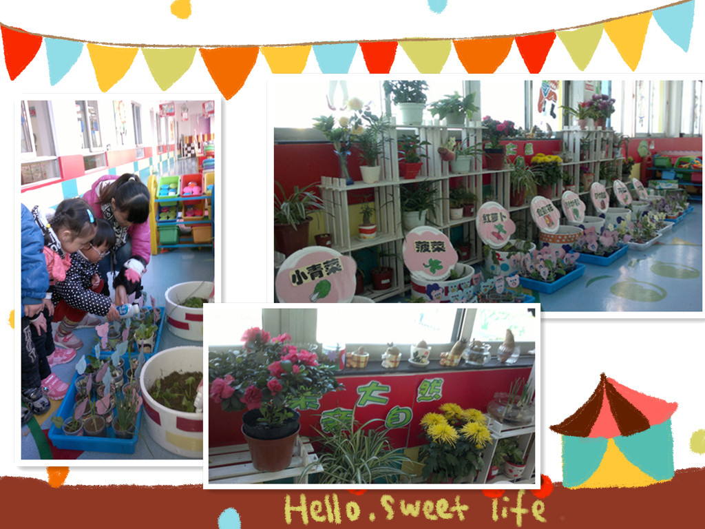 这些自然角中的植物都是孩子们在老师的指导下,在家长的帮助下自己亲手种下的,体现了人人参与,集体管理的风格。除了有多种盆栽植物,还有各种各样的蔬菜:芹菜、香菜、大蒜、土豆、萝卜、菠菜、山芋等。孩了子们每天到幼儿园第一时间就可以看到自己种植的蔬菜,各年级自然角在老师、孩子和家长的精心创设下,在管理和设计上凸显了年龄特点,各有创意特色。