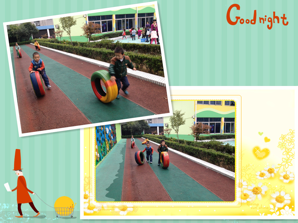 为能够更好的开展体育活动,发展幼儿身体协调能力,茶山中心幼儿园的老师们结合轮胎低碳、环保、安全的特质,收集废旧轮胎。利用上班的空余时间,将轮胎清洗去污后、涂上色彩鲜艳的丙烯颜料,绘上了幼儿感兴趣的图画,将其变废为宝,成为孩子们游戏的法宝。