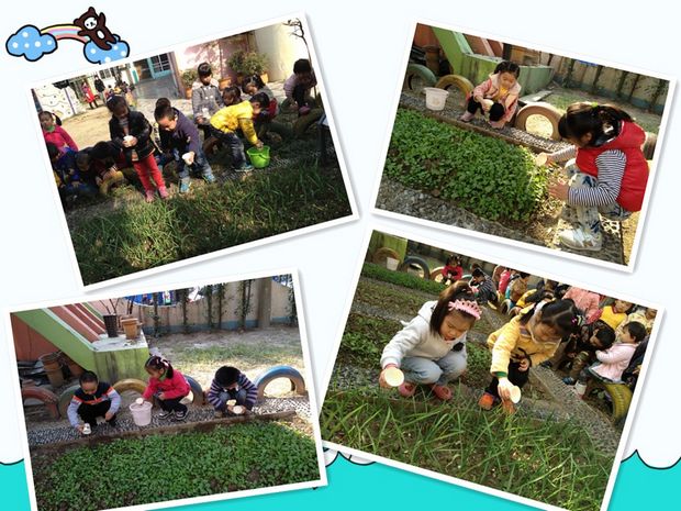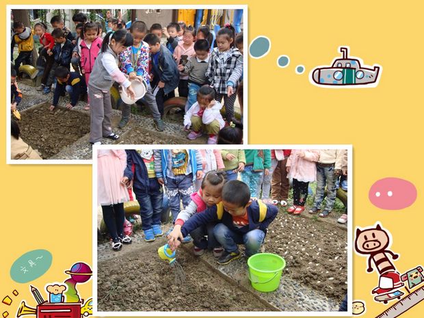 实幼的老师们为了让幼儿能亲身参与到种植活动,观察了解种植的每一个步骤,并感知植物的生长过程,体验收获的快乐,她们将种植活动纳入日常的教学活动工作。围绕种植开展了丰富的活动:通过故事、老师讲解、种植园地大胆尝试等了解种植的方法。因此就经常看见孩子们带着水桶和小铲子,来到种植园地,松土、播种、浇水、期盼种子的快快长大……就这样,在孩子们和老师们的细心照顾下,我们一起种植的菠菜、青菜和大蒜都长得好好啊!瞧,孩子们的神情多兴奋啊!相信在这一刻他们真真切切地体会到了辛勤播种、快乐收获的滋味了。