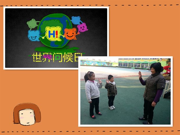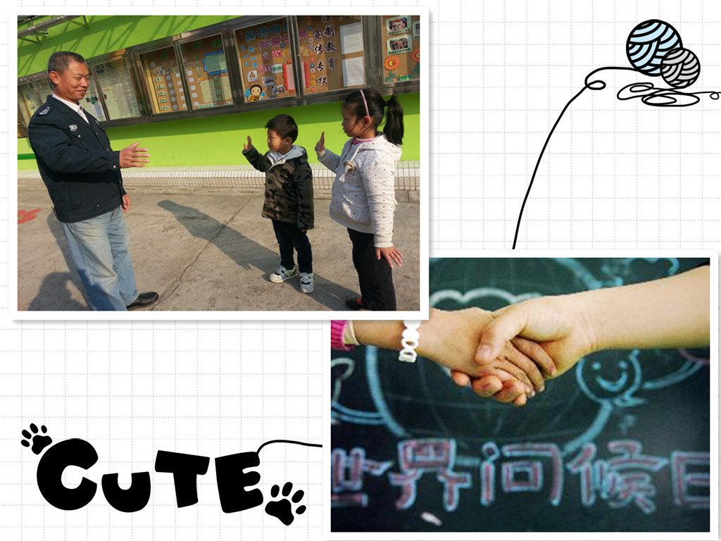 在这个问候日,我们小朋友如何做呢?问题一提出,孩子们纷纷举起了小手,有的说:我看到我们幼儿园的老师,会主动与她打招呼并给她一个飞吻;有的说:看到门口的保安叔叔会主动问好,和他握握手;还有的说:看到食堂里的阿姨、叔叔会主动问好,因为他们每天为我们做饭很辛苦;看到小弟弟、小妹妹会给他们一个拥抱,让他们不再害怕上幼儿园。