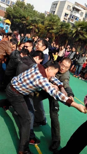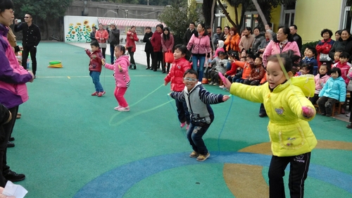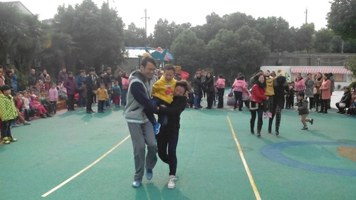 在上午的亲子运动会中,小朋友们和爸爸妈妈们一起参与了《老虎吃汤圆》、《踩石过河》、《快乐指路》、《抬轿子》等童心童趣的亲子游戏比赛,还有十分精彩的家长游戏——拔河。小小运动员们天真精彩的表现和爸爸妈妈们洋溢在脸上的重温童乐的喜悦相映成趣。呐喊声·欢呼声此起彼伏,充满了幼儿园的每一个角落。在节奏明快的加油声中,小朋友们像一个个快乐的小精灵,尽情释放着心中的快乐。