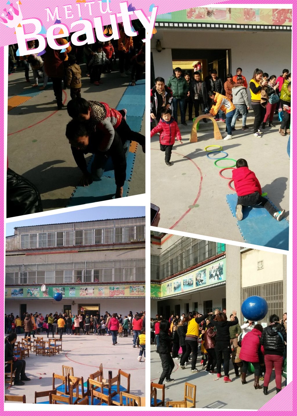 随着第一个游戏《欢乐叭叭叭》,热闹的气球被踩破叭叭叭的声音,运动会正式开始了。《宝贝传送带》不仅体现了家长的体力,还让小朋友感受到了被抱的温馨。《背宝宝大比拼》中看出了亲子之间的默契程度。《大象套圈圈》让每个小朋友都参与进来,体验成功的欢乐。《铺小路》锻炼了孩子的灵活能力和家长的快速反应能力。最后一个《戏龙珠》整个年级的家长和幼儿围成双圈,传递大龙球,家长和孩子欢声雀跃,热闹沸腾,将运动会推向了高潮。
