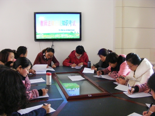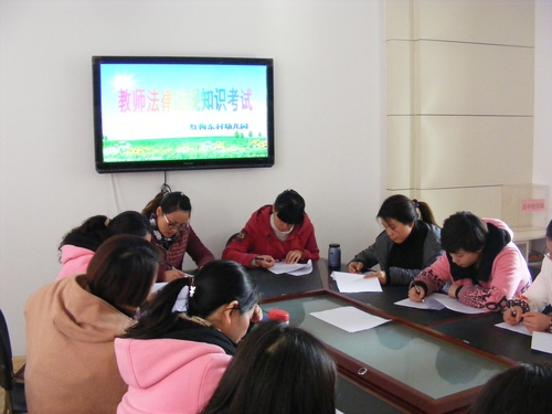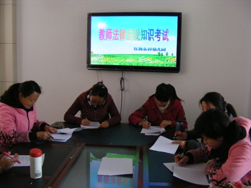 红东幼儿园通过教职工大会、法制讲座、师德培训活动等组织全体教职工认真学习《中华人民共和国宪法》、《教师法》、《未成年人保护法》、《预防未成年人犯罪法》、社会主义法治理念、“六五”普法规划,以及经济、社会、平安建设中与工作生活密切相关的法律法规,人人成为知法、懂法,守法的教师。园于12月4日组织了一次全体教师法律法规知识考试。教师们认真思考、仔细答题、奋笔疾书。本次活动的开展,切实提高了红东园教师学法守法用法的意识,为红东园依法治校打下了坚实的基础。(zyn)