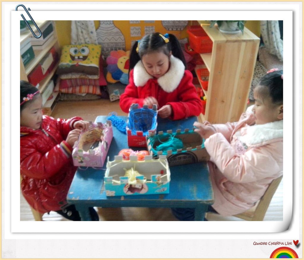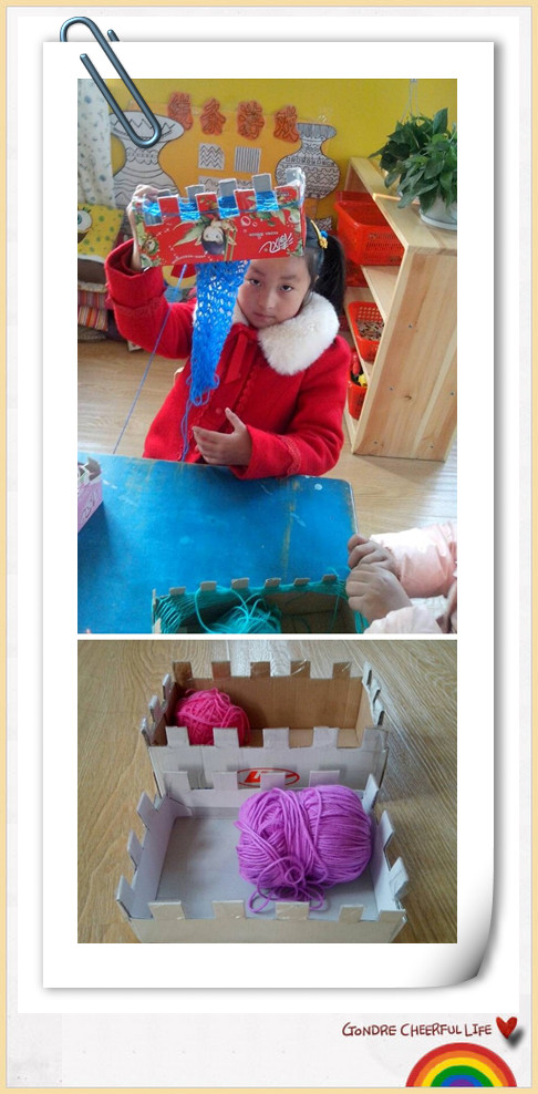 鞋盒手工编织不仅丰富了孩子们的区域活动,也锻炼了孩子们的动手能力,让他们体验了成功的喜悦,以及和大家一起分享自己劳动成果的快乐。