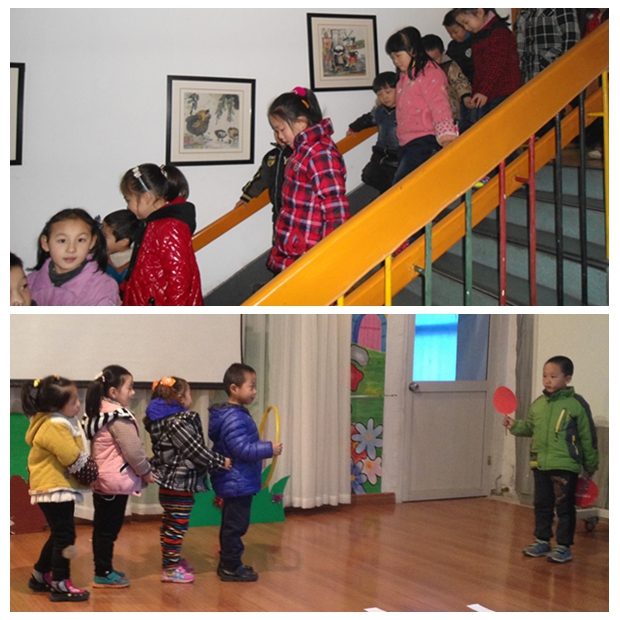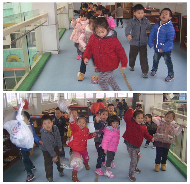 虽不能进行户外活动,但幼儿的运动需求也要得到满足。我们通过室内空间资源的开发,让幼儿在雾霾天也能获得充足的锻炼。你瞧,大班小朋友带小班的弟妹在走楼梯,快速登梯,能提高心肺活动量。中班的小朋友利用多功能教室的宽敞空间开展各种有趣的体育游戏。蒙氏班的小朋友更是利用本班的走廊资源,组织了绕桩走、玩圈、飞舞的彩球等游戏。