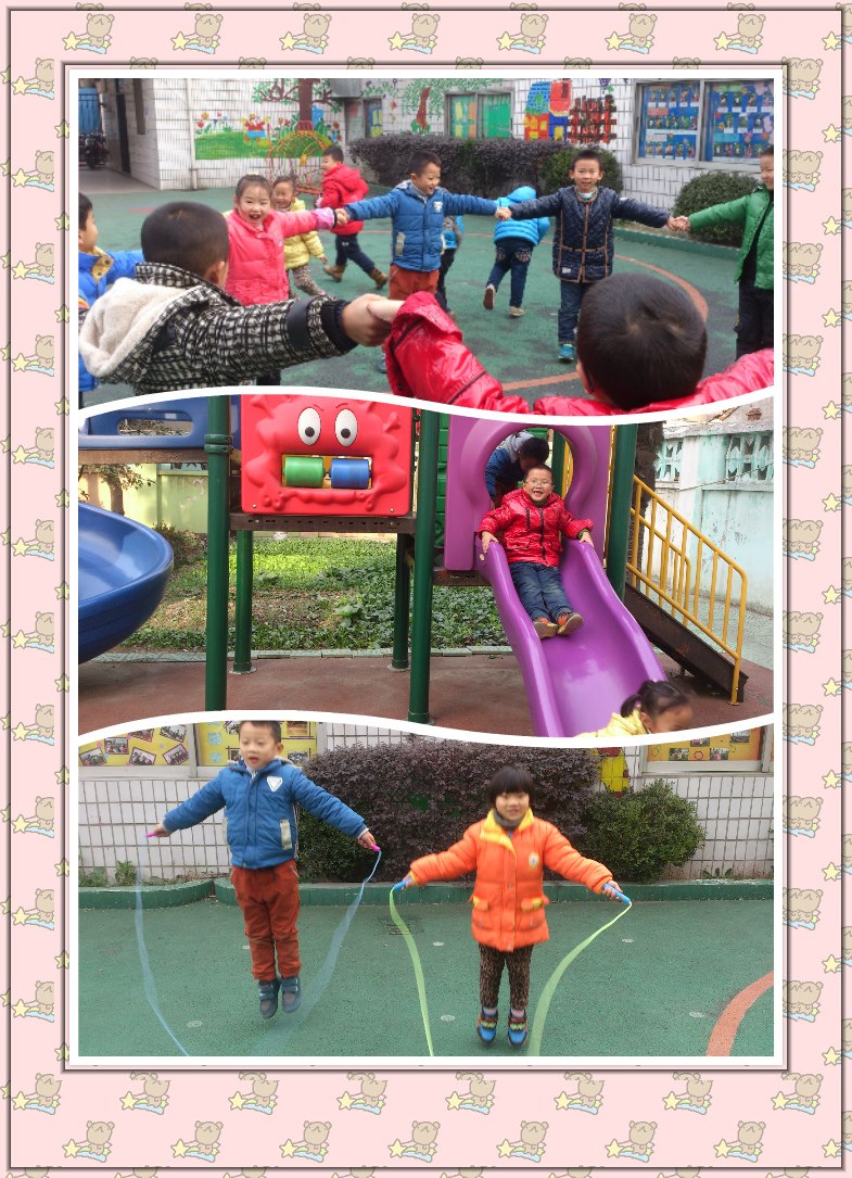 每天早上8点,幼儿园里就会准时响起活泼、欢快的音乐,老师带领幼儿来到户外,他们随着优美的音乐跳绳、垒高、障碍走、滚塑圈、做律动。活动中老师坚持集体活动和小组活动相结合的原则,有目的、有计划的组织活动。各班 老师还结合本班幼儿的兴趣特点,改变以往的的理念,设计了许多有趣好玩的户外体育游戏,如“网小鱼”、“爱的抱抱”、“贴烧饼”等。在活动中,幼儿情绪高涨、专注投入、欢呼雀跃、快乐无比。