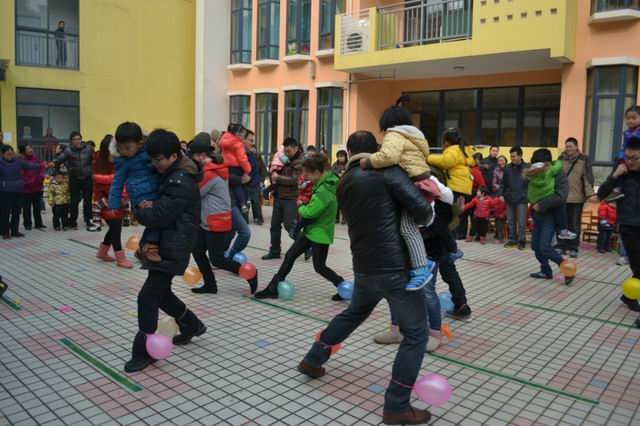 瞧!这边正热火朝天得进行着踩气球的比赛呢,家长脚上绑着气球,抱着自己的孩子,在裁判员的一声令下,各参赛家庭开始互踩气球的游戏,脚上气球全被踩掉的家庭自动淘汰回班级,坚持到最后的家庭为获胜者,各参赛选手且攻且守,比赛紧张而欢快地进行着。