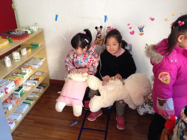 童趣十足的医生,护士道具服,惟妙惟肖的表情,在老师的指点下,一切都在中三班新开的区角——“爱宝乐园”里如火如荼的展开着。他们现学现演,从刚开始不熟练自己的角色,然后通过互相交流讨论,发现各个角色的性格特点,能在同伴面前大胆的表现自己。只见小朋友穿着专业的医生、护士服装,在“爱宝乐园”里用娴熟的动作、语言、表情演绎着自己的角色。小护士,小医生,小顾客们带着生病的宠物互相配合,小护士认真的帮助顾客、取药,小医生们认真的帮宠物们认真的看病,测量体温,打针,挂水。按照真实医院的流程挂号(取号)——看病——取药付钱——挂水打针尽然有序的进行着。孩子们在生活中非常喜欢假装和幻想,喜欢角色扮演,喜欢故事,而幼儿期又是语言发展的关键期。