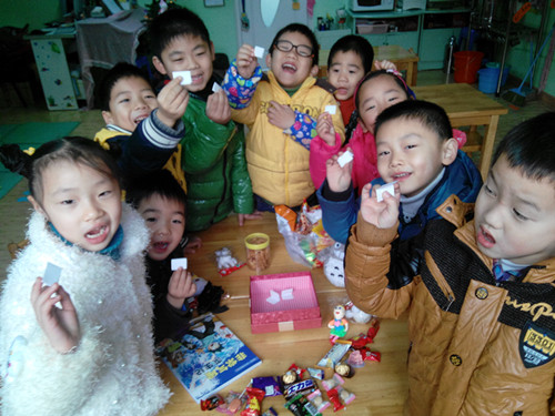 圣诞节一早,小智诚班的门口就出现了一对开心的“圣诞老人和圣诞老婆”,每个孩子到来时都会收到他们的圣诞礼物;花苞苞的小朋友们更喜欢来到小智诚班与哥哥姐姐们一起混龄欢度圣诞节,弟弟妹妹轻轻地与哥哥姐姐一起做游戏、抽奖拿奖品、分享礼物与好吃的零食,还递送给老师一同分享呢!懂事的孩子们在老师的引导下,还决定将礼物送给周边的朋友和需要帮助的人,让孩子们发自内心的奉献出自己的纯真爱心;从而培养孩子们乐于助人的情感,从小就培养一种正能量,不断茁壮成长!