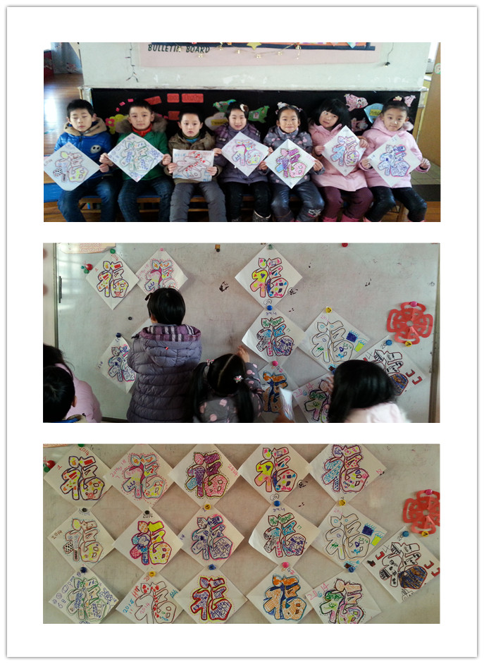 活动中,孩子们首先热烈地讨论着装饰“福”字的各种方法,然后孩子们纷纷寻找、收集着装饰所需要的材料,准备就绪后,拿到福字的孩子们一个个都迫不及待地要一展身手。有的在“福”上画了一匹匹小马;有的在“福”上画了五彩缤纷的烟花,还有的在“福”上画了好多烟花;还有的在“福”上画了一颗颗爱心。经过孩子们的精心装饰,顿时这些“福”就充满了童真、童趣,也增添了更多的喜感。
