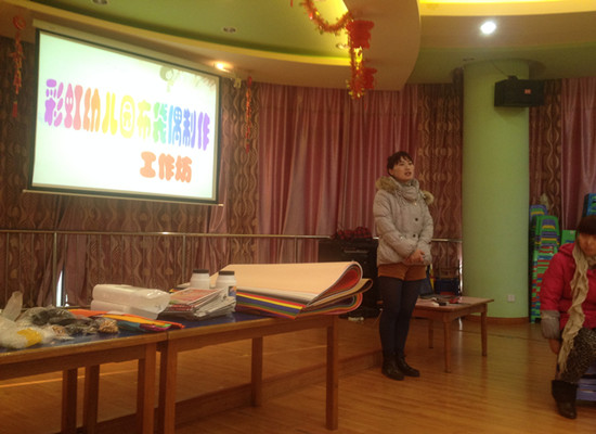 临近学期结束,虽然天气寒冷,但我们彩虹幼儿园却是热火朝天。近几日,俞老师、蒋老师协助副园长缪洁对彩虹幼儿园全体教师进行了一次“布袋手偶制作”的实践培训。