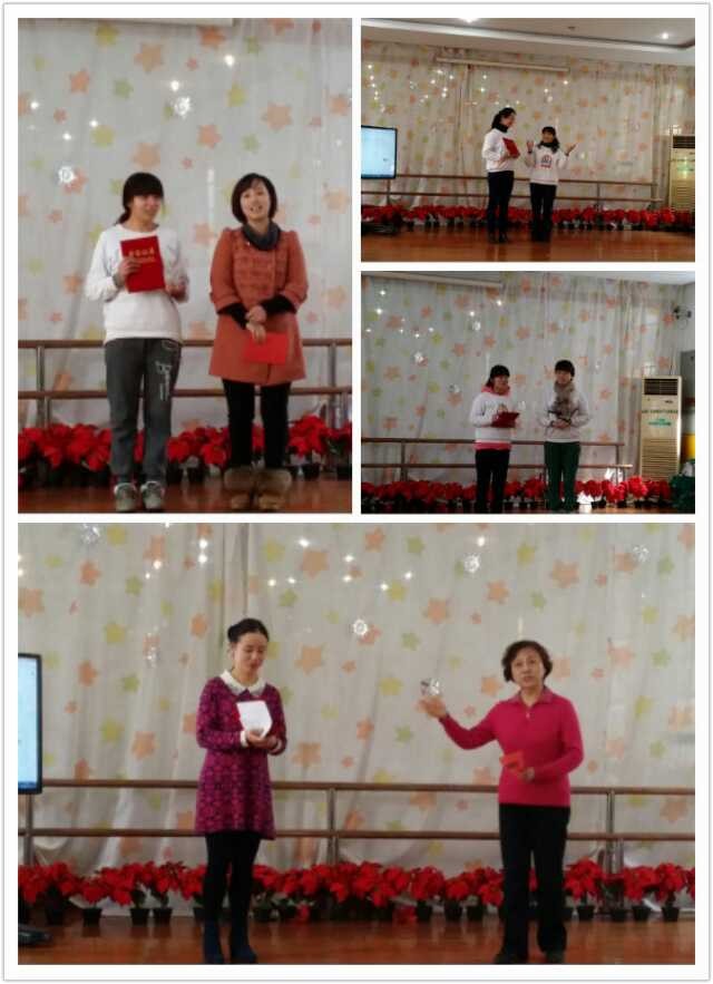 整个总结活动在一首热情洋溢的《喜娃娃》中拉开了序幕,老师们用快闪的方式全体参与,也体现了教师团队的凝心聚力。活动围绕“师德、教学、服务”三个方面对本年度的各项工作进行了有针对性的回顾。对2013年度园内涌现出来的“优秀班主任”、“最佳奉献奬”、“教学之星”、“家长工作之星”等岗位之星进行了表彰。汪园长在会上作了热情洋溢的讲话,她代表党支部、园行政向一年来辛勤工作在教学、管理、后勤服务一线的全园教职工表示衷心的感谢,向受表彰的先进个人表示热烈的祝贺。她说:2013年是幼儿园发展的一年,也是收获的一年,在未来的2014年,我们将进一步明确“特色不能丢,服务要更优”的努力方向。最后大家在一首寓意深刻的《最美的未来》歌声中结束了总结活动。