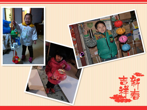 瞧:孩子们正在高高兴兴地跟着爸爸妈妈、爷爷奶奶们学做各种漂亮的灯笼:兔子灯、青蛙灯、元宝灯、宫廷灯、彩球灯------在家长们精心营造的浓浓的节日气氛中,孩子们了解了元宵节的来历和许多风俗习惯。