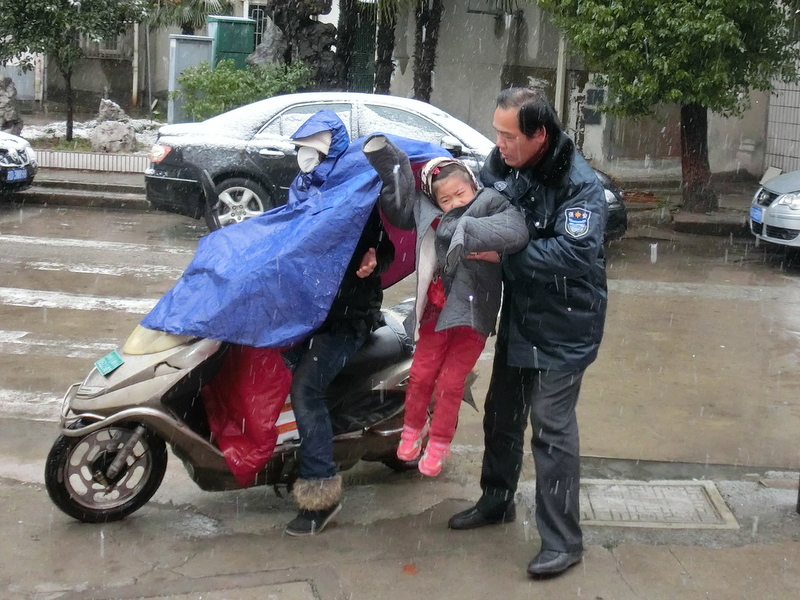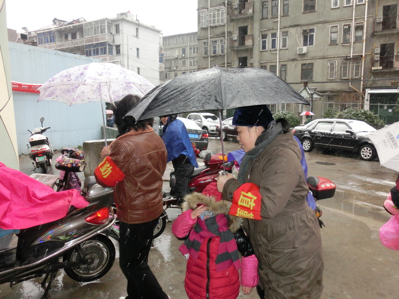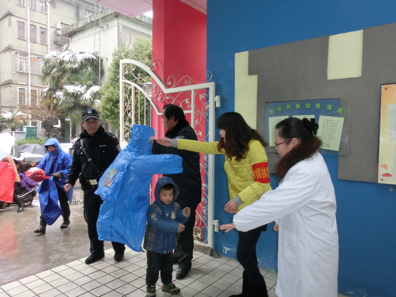 家长护卫队实行班级值班制,每周由一个班级的家长轮流负责一天的护送工作。每组家长两人,在上学、放学的二个时间段,即早上7:55—8:40,下午3:45—4:10,一天2个时间段值班,协助幼儿园保安、值日教师,加强校门口交通疏导和幼儿过马路护送、排除可疑人员。“孩子,请你靠里边走”、“请家长持卡排队”、“请让孩子走通道”……入园高峰期的拥堵现象开始缓解,秩序更为井然有序了。