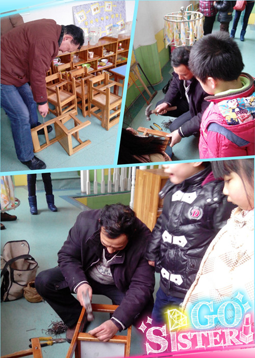 新学期第一周,常州市娑罗巷鸿安幼儿园的小朋友们当起了小小管理员。大家发现有些小椅子需要修理了,就与老师一起将小椅子归归类,还认真地跟木匠师傅学习了起来。老师也开拓着幼儿的思维,让孩子们自己去发现用什么材料与方法去进行修理与清洁小椅子。幼儿在活动中体验着思考和劳动的快乐,并结合儿歌“小椅子,双手搬;轻放好,再坐上;人离开,椅收起;爱护它,常擦洗。”用语言来表达,更好地掌握了擦椅子的步骤。 这次的修理活动幼儿不仅懂得了要爱护小椅子,轻拿轻放;还明白了爱护公物、保护环境,大家要从现在起就养成良好的习惯!