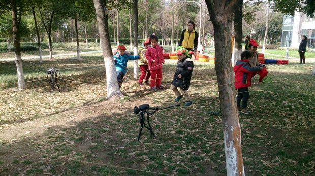 自“丛林”建造之后,孩子们对丛林的兴趣也越来越浓,因此近阶段为了顺应孩子的兴趣,同时将该活动推向最高潮,我们充分利用了社区资源,利用社区里的一片树林地,将孩子自制的一些“树”、“蜘蛛”、“鸟窝”等塑造了一个微型丛林,从而一个真实的丛林展现在了孩子们的眼前,神奇的“丛林探险”活动也随之展开了。
