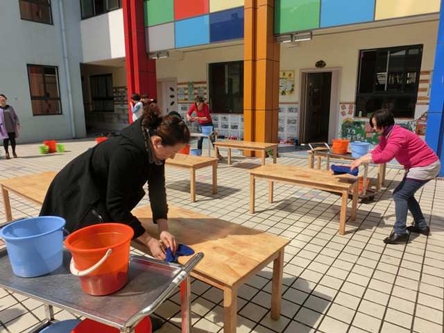 比赛以年级组为单位进行,按流程有序进行清洗杯子、消毒桌面、整理床铺等项目。评委则从“消毒规范”、“操作规范”、“时间规范”等方面进行打分。在比赛的过程中,教师们都认真按照要求进行操作。评比结束